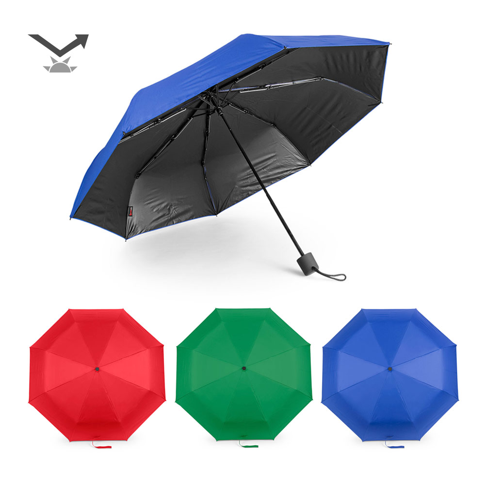 Paraguas 21 pulgadas x 8 cascos, apertura en 3 secciones manual. Con tecnología windproof que garantiza buena resistencia al viento. Antibrisa. Mango plástico con recubrimiento en goma. Protección UV. Incluye funda.